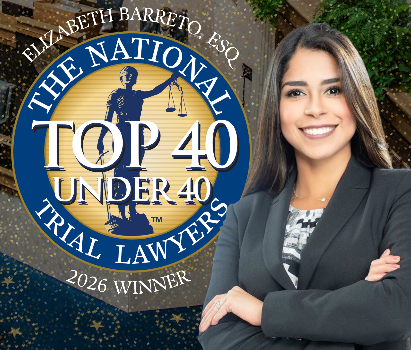 Barreto Law Firm is proud to announce that our founder and lead attorney, Elizabeth Barreto, Esq., has been officially recognized as a Top 40 Under 40 honoree. This prestigious award is reserved for a select group of attorneys who demonstrate superior qualifications, leadership skills, and trial results in their respective states.